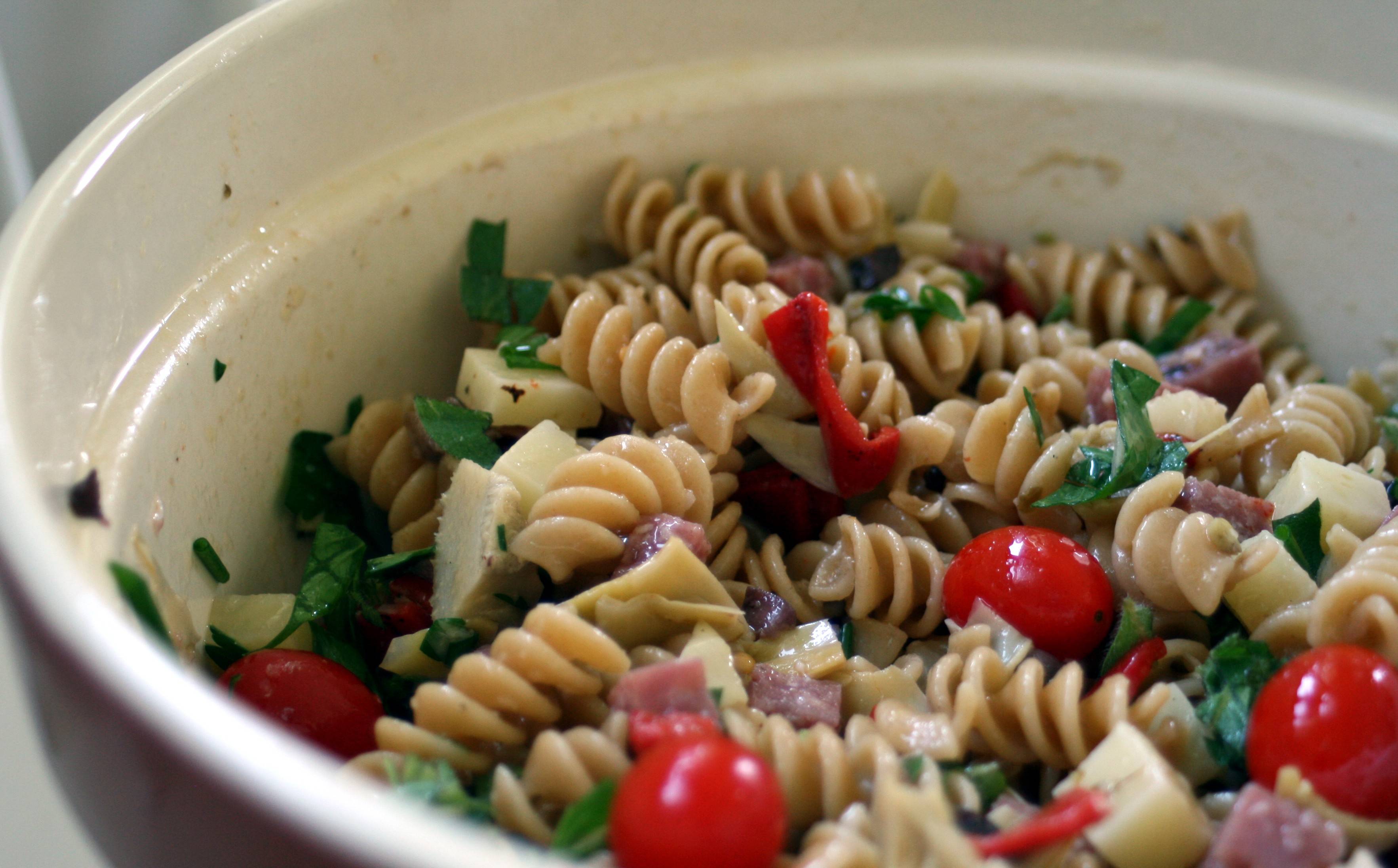 3) Add salami/vegetable mixture to pasta when pasta has cooled (otherwise, your cheese will melt.) Add herbs and salt and pepper, stir well.