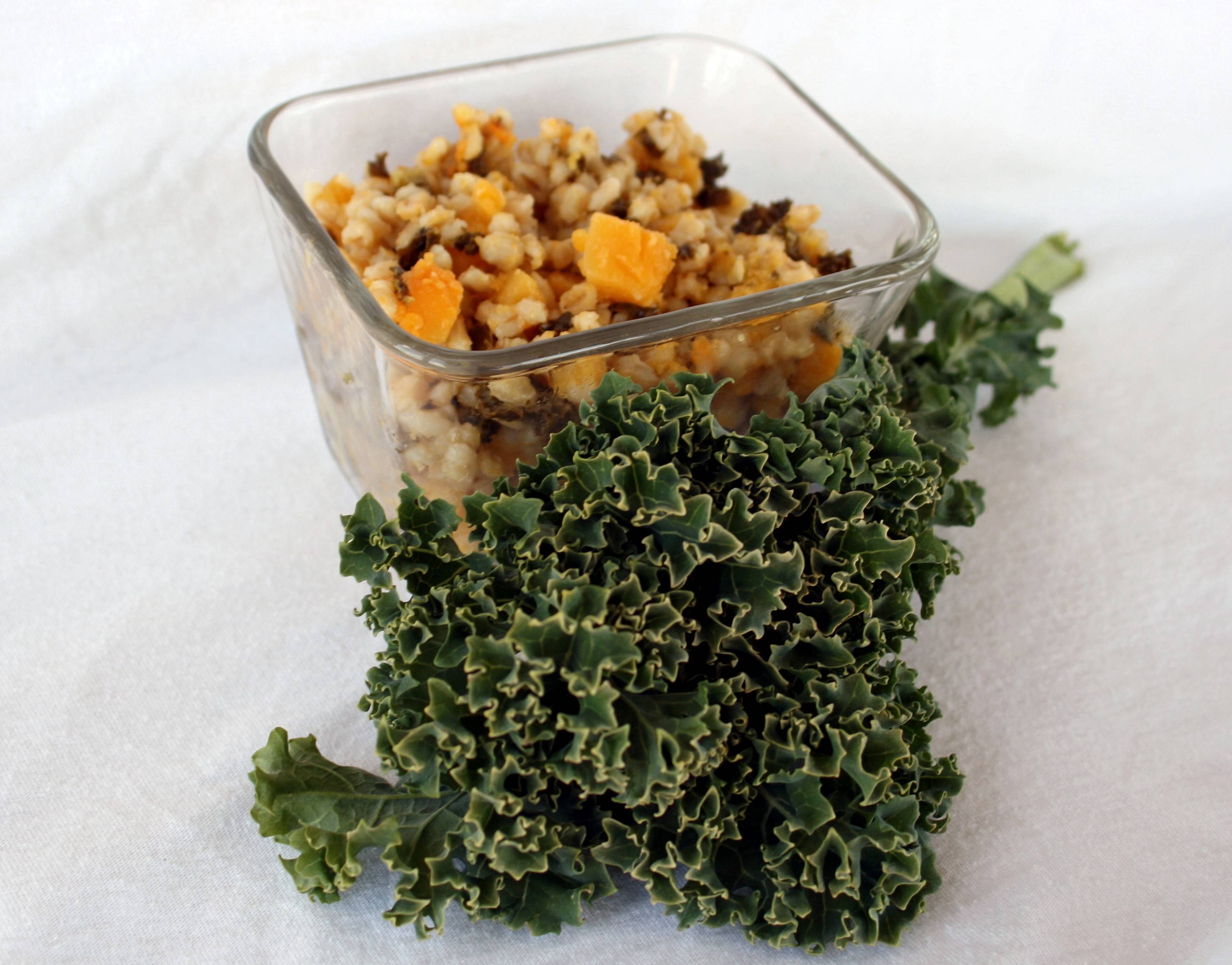 Preheat oven to 400 degrees while you add oil to a warm Dutch oven or large oven-proof pot with a lid. Add garlic and thyme, and cook until fragrant (about a minute). Add barley and stir with oil until coated, add salt and pepper. Add wine or juice and cook, stirring until mostly absorbed. Add squash and broth. Bring to a boil, stir in kale, and cover with lid. Bake in oven until barley is tender and the liquid is mostly absorbed, about 30 minutes.