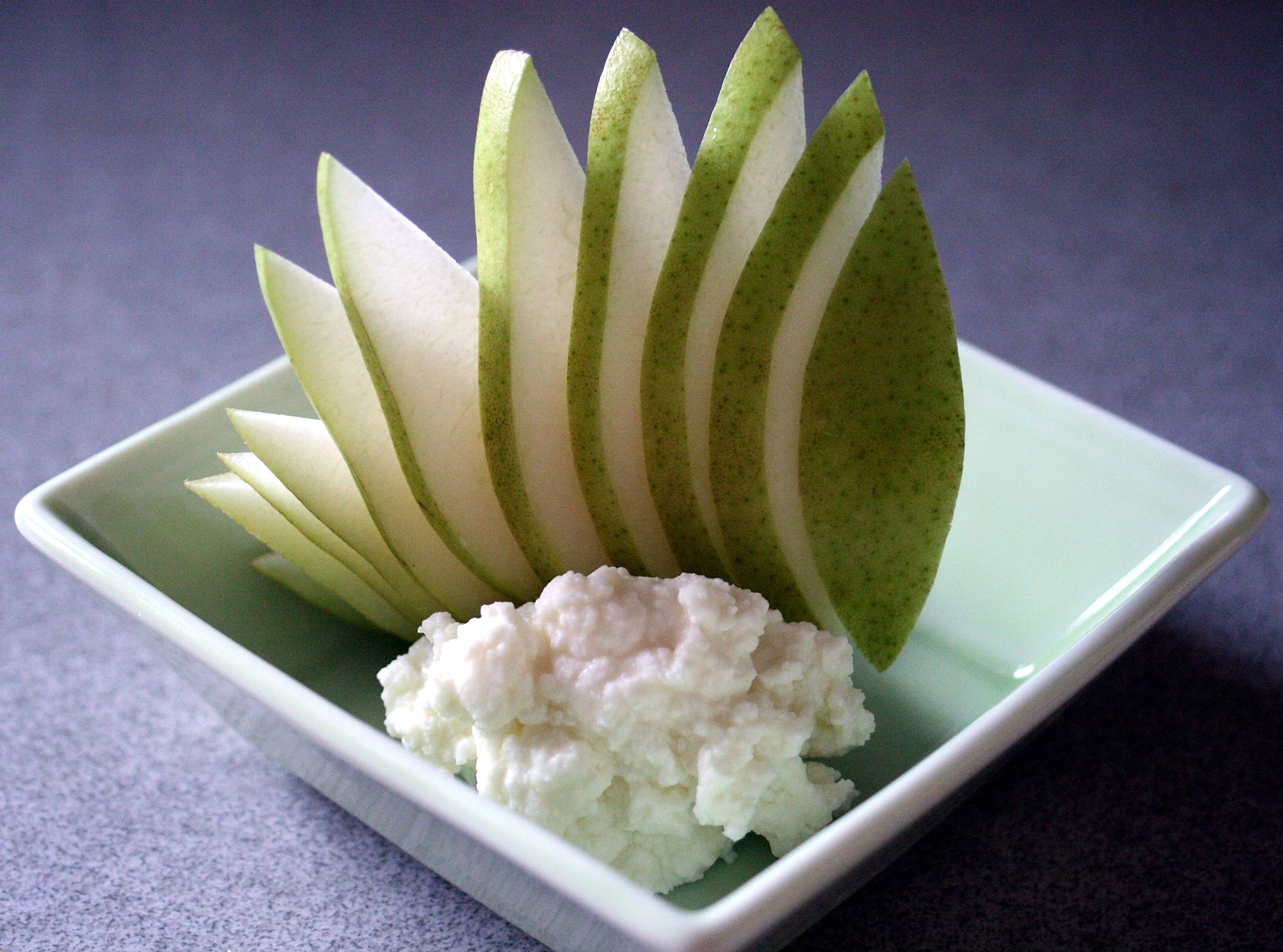 A really long intro to a really, really simple snack! A sliced ripe pear, accompanied with a sweetened soft cheese for dipping. I was lucky enough to have some delightful Honey Lavender ‘Driftless’ fresh sheep’s milk cheese from Hidden Springs Creamery. If you are not as lucky as I am, you could use ricotta with a bit of honey mixed in.