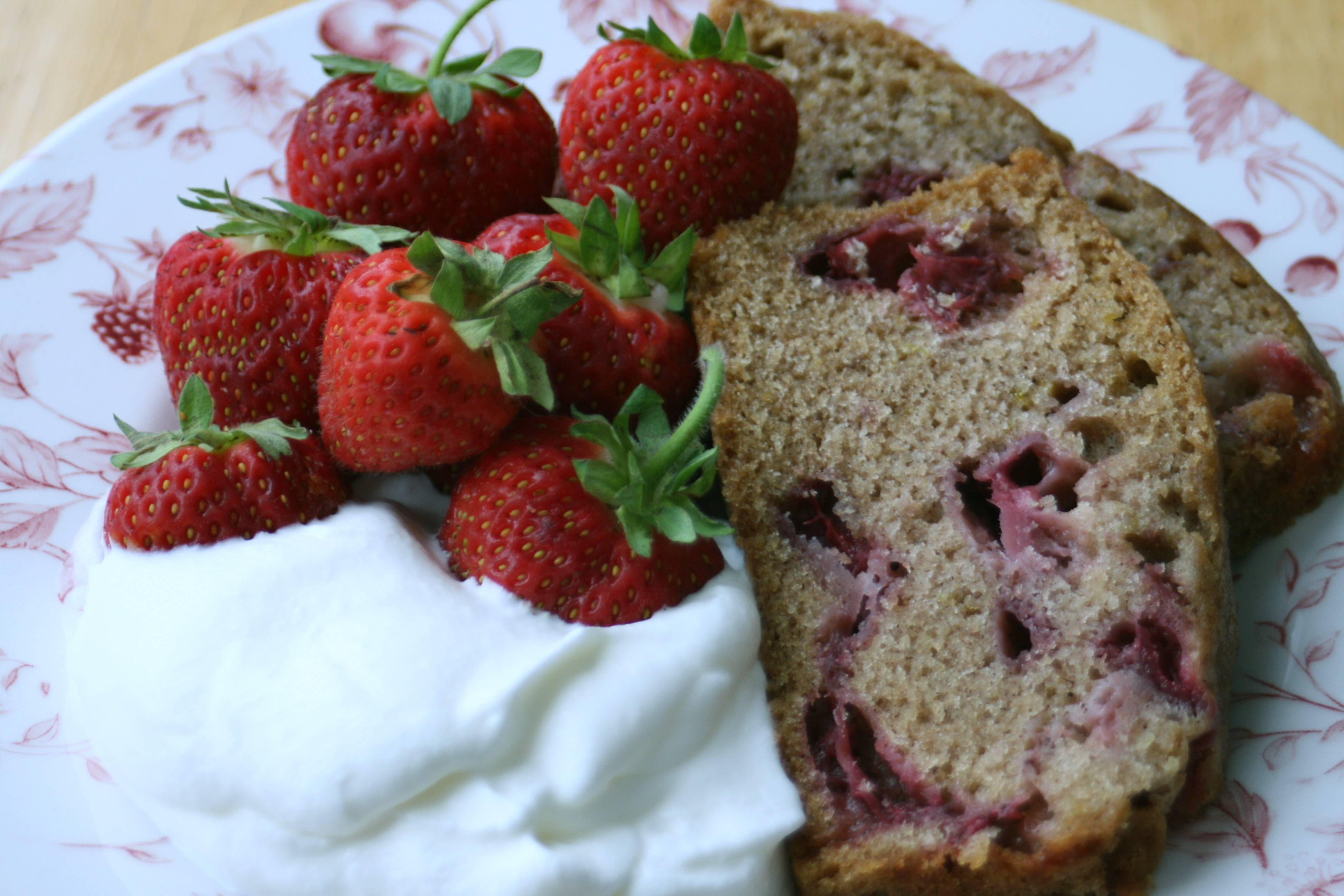 This recipe was utterly delicious, and to be honest, I was a little surprised. I mean, I knew it would be good, but this is one of those recipes whose finished product transcends its ingredients. Based on everything you’re putting in the bowl, you think it will be good. But something happens in the oven – and WOW. There is a ton of cinnamon in this recipe, which to be honest, I almost omitted or reduced. Strawberries and cinnamon seemed like odd company to me. Cinnamon is all toasty autumn, and strawberries are bright summer. But, I’m glad I didn’t, because I think the cinnamon is the secret. It gives the bread (really, almost a cake) a lovely caramel color, and a depth of flavor that is nuanced and deep – the bread really doesn’t taste ‘cinnamony’ at all.