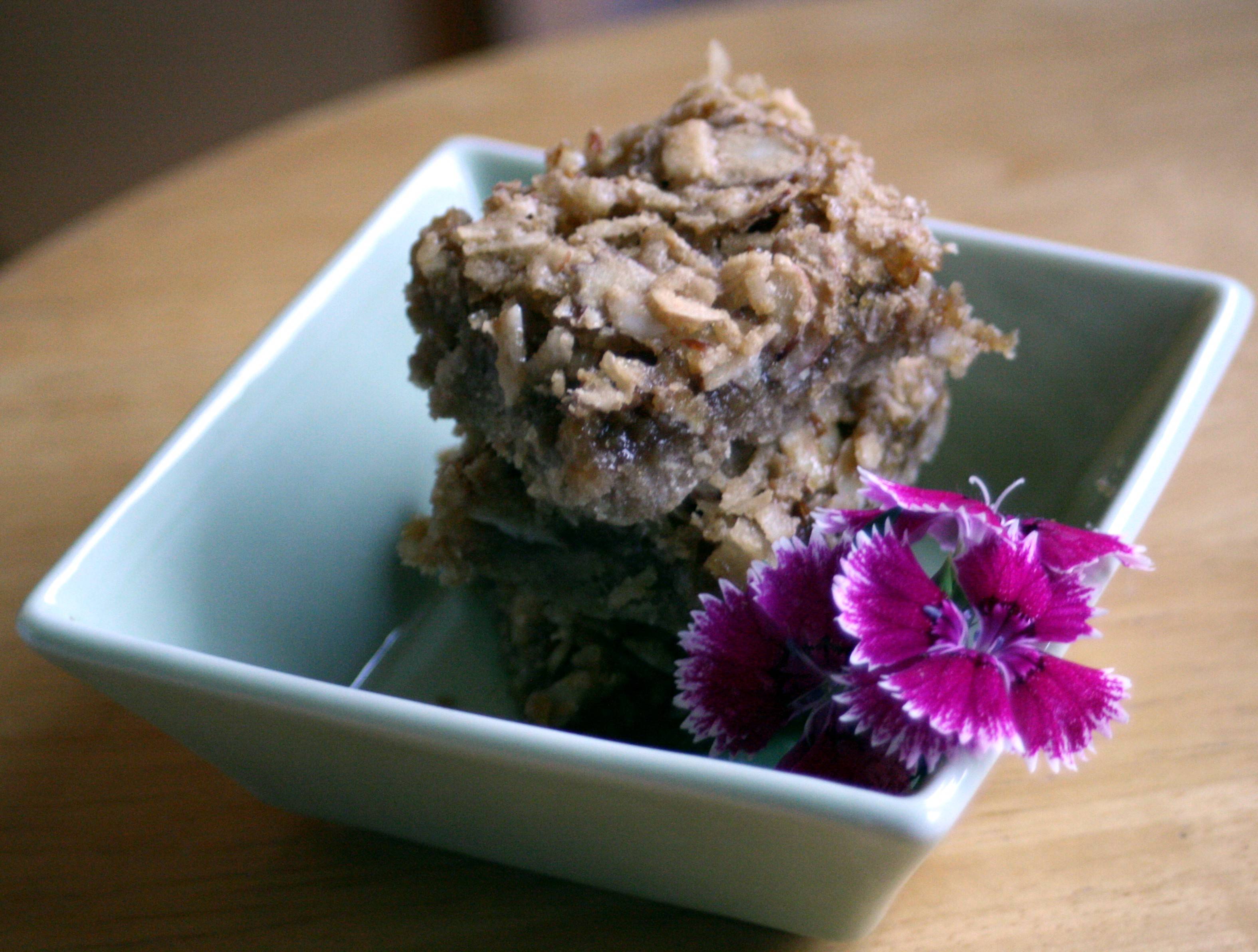 1) Preheat oven to 325 degrees. Dump everything into mixer and mix until coarse crumbs are formed. Press into well-greased 9×13 pan. (Recipe recommended to line the pan with foil, with overhangs on each side, and grease well. Probably a good idea, as these bars are very sticky, but I did ok with an extremely well-buttered glass dish.)