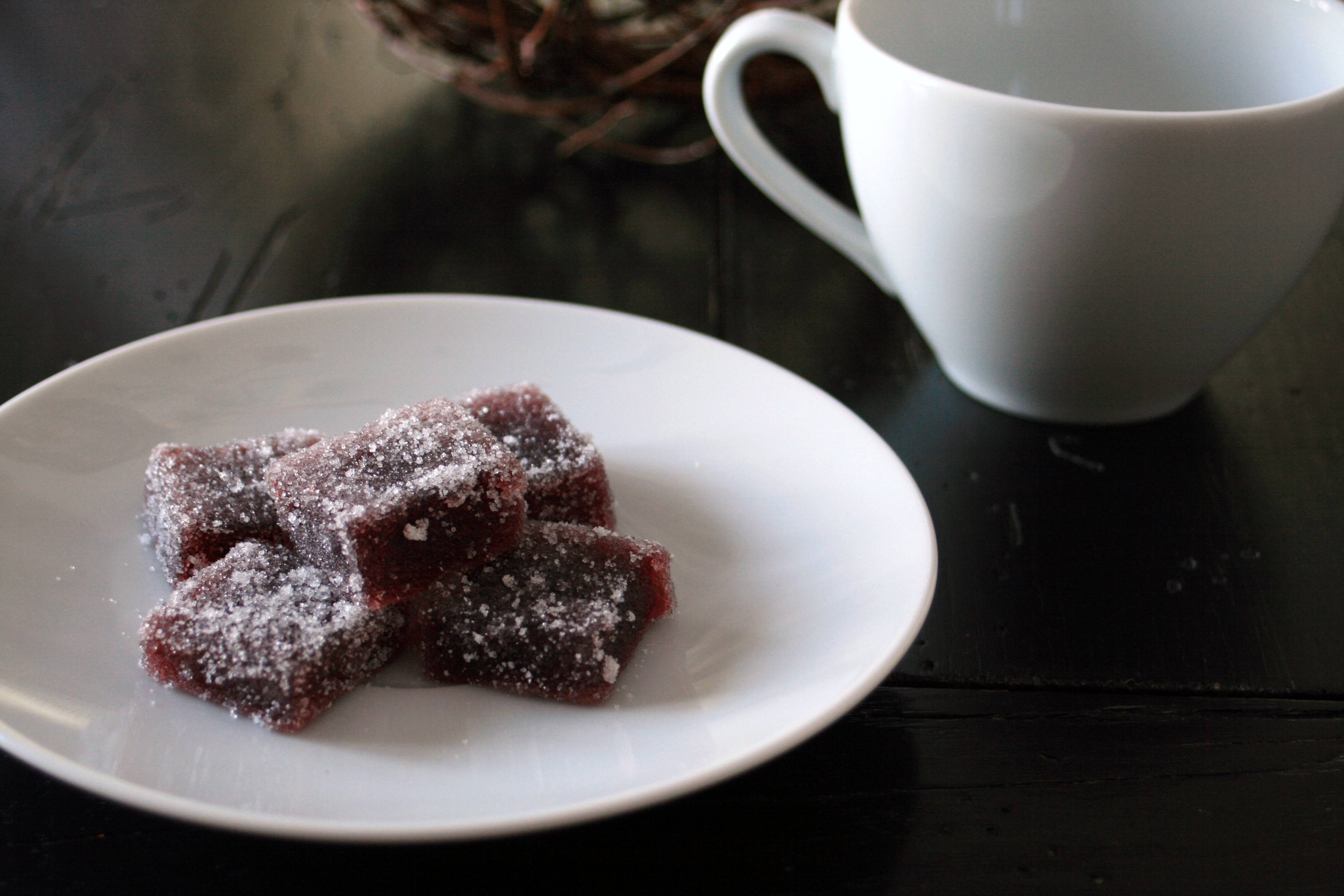 5) Put 1 cup sugar into a shallow dish. Cut pâte de fruit into 1 inch square pieces, and coat in sugar.