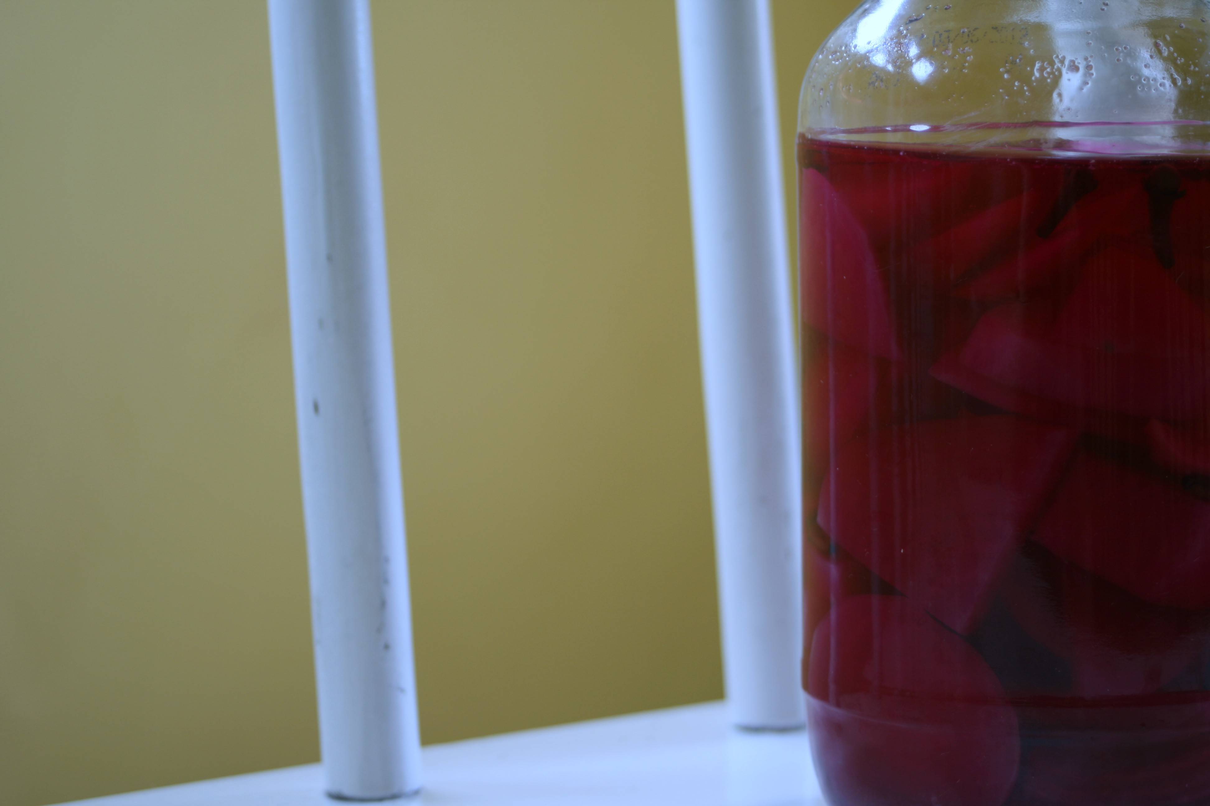 2) Place clove studded onion and ginger on the bottom of a well-scrubbed glass quart jar. Add beets and pickling liquid. Store in the fridge. Wait a few days, and then enjoy for several months (if they last that long.)