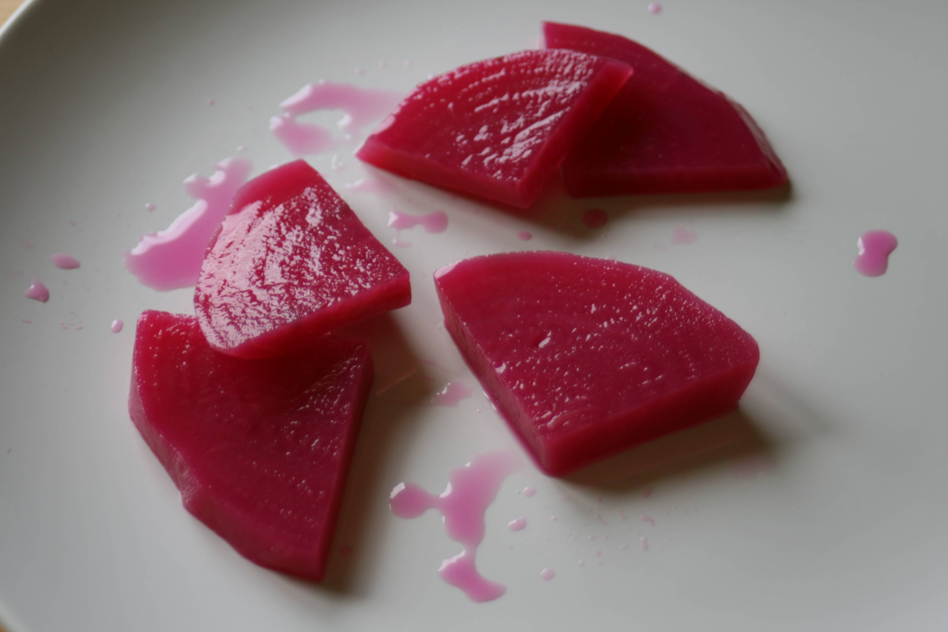 1) Combine vinegar, water, honey, salt, and beets in a medium saucepan. Bring to a boil, then turn down heat and simmer for 20-30 minutes, until beets are fork-tender.