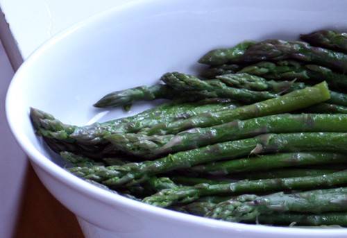 Her recommended method is simple, and if well-timed, yields perfect asparagus in its simplest cooked form. Here are the directions: Bring a few inches of water in a large skillet to a low boil. Put in similarly sized asparagus, with the tips all pointing the same direction. Boil for 6-10 minutes, depending upon thickness. Remove from water, pat dry, and dress however you’d like.