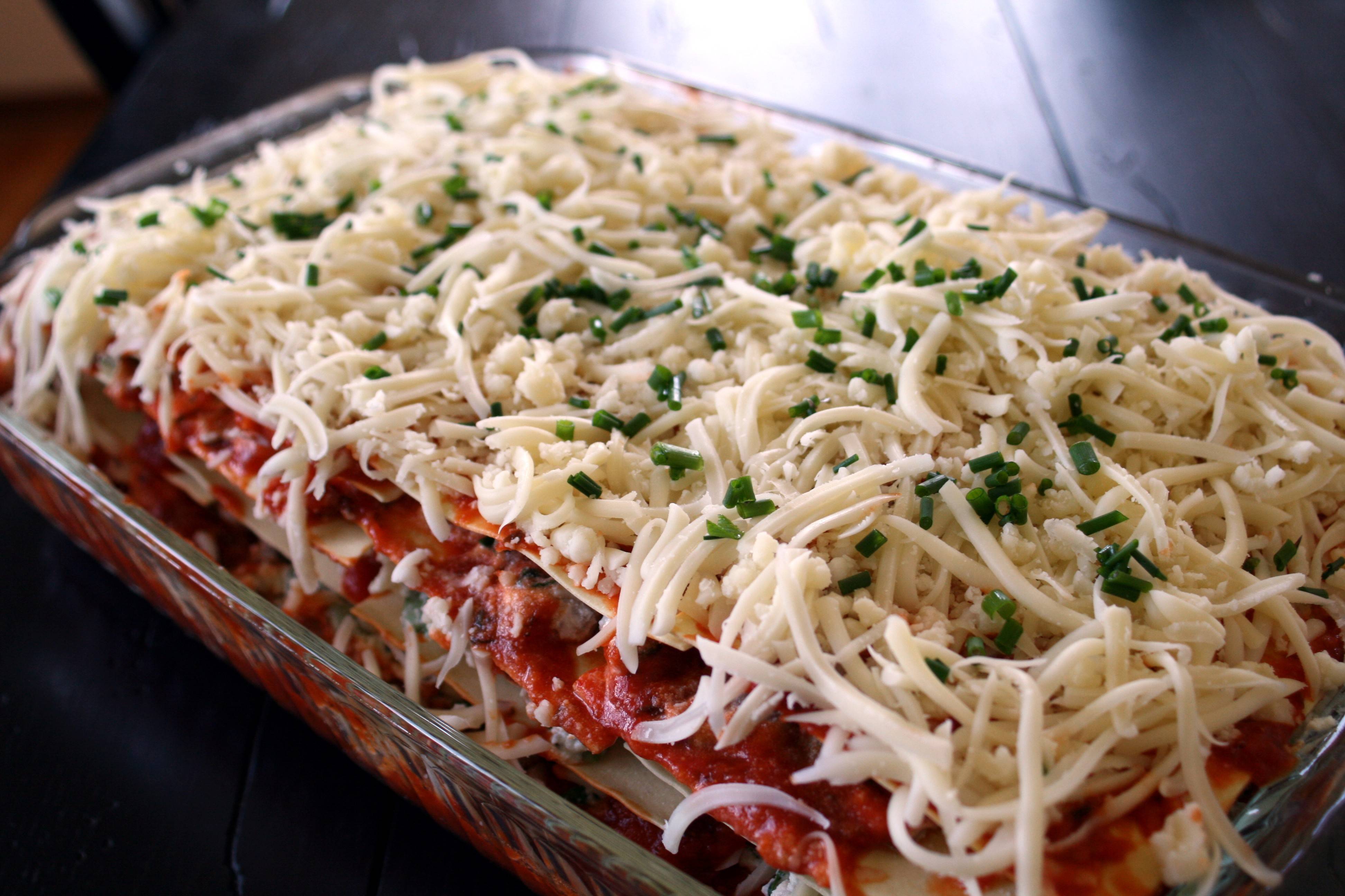 6) Top with last of your noodles, and add all remaining sauce. If using no boil noodles, make sure all top noodles are well-coated with sauce. Top with last two cups of mozzarella, and sprinkle with remaining chives.