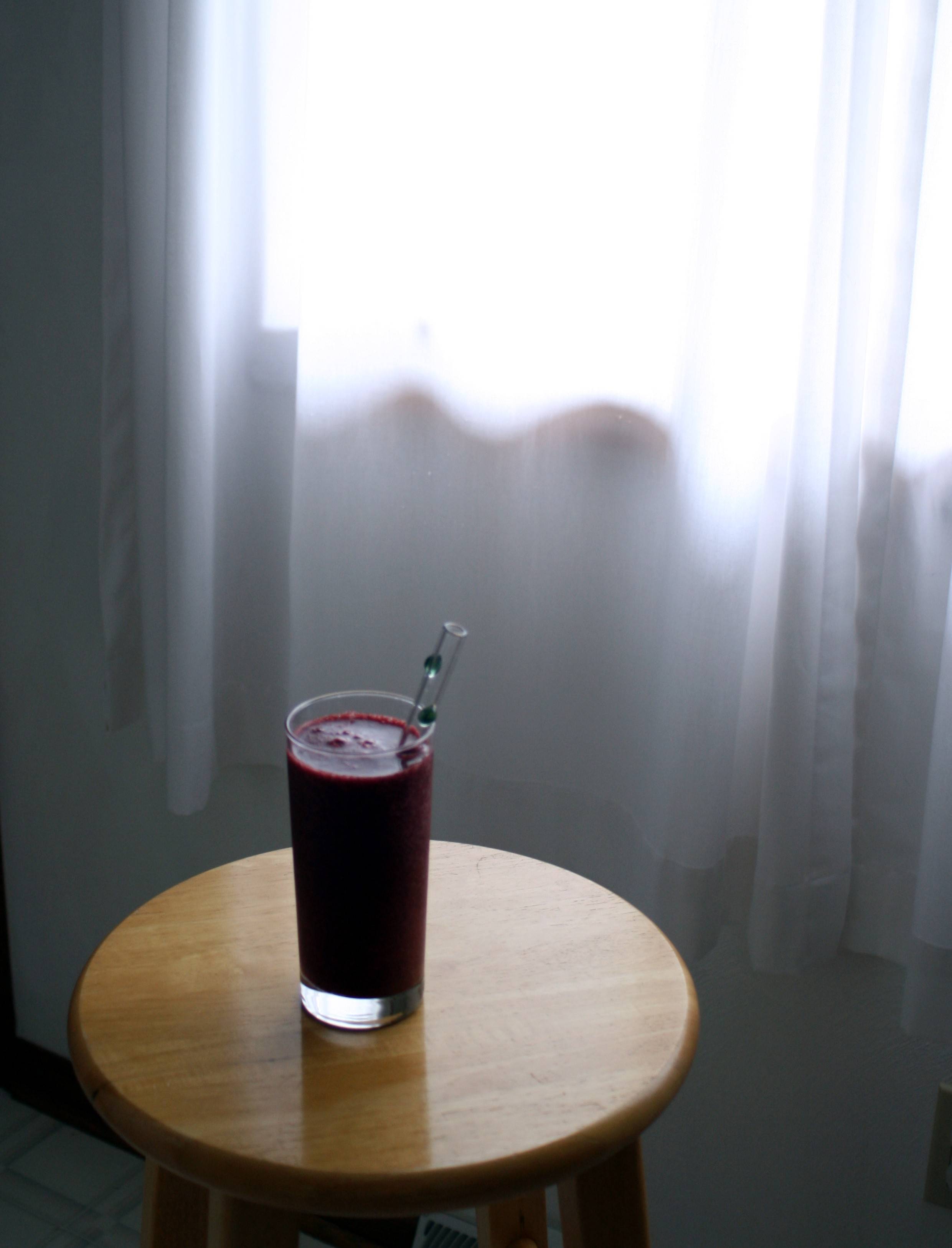 Fruits are the most difficult, and I am often putting pineapple, mango, and other tropical goodies in my smoothies. The other morning I wanted to attempt a totally local smoothie, both for the health, freshness, and environmental-friendliness of it (less fuel burned to get the food to my stomach.) Once I started thinking about it, there were quite a few options! I did break the seasonality rule a bit, by breaking out my frozen blueberries. But I put ’em up, so I figured I could enjoy them.