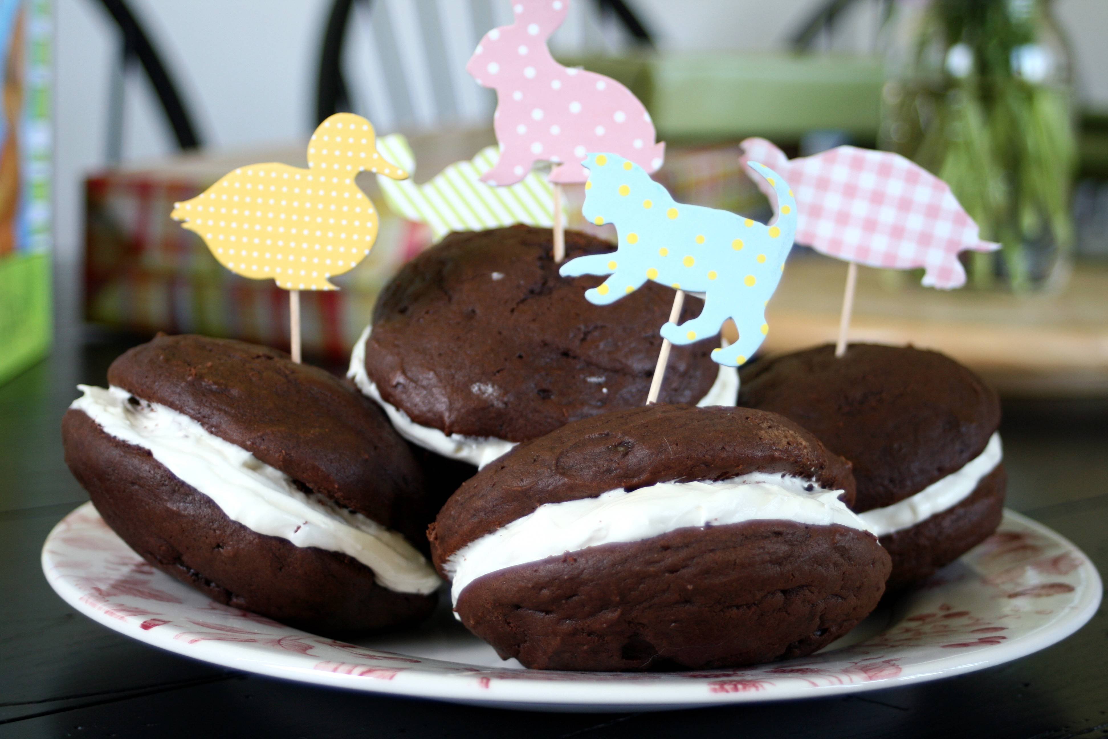 Now these are not as familiar as I imagined, so in case you haven’t had the privilege of eating one, it’s essentially a chocolate cake-like cookie, with a lovely vanilla buttercream/marshmallow fluff filling. Absolutely perfect for a kid’s birthday – and bonus, you can make the cookies, the filling, or the entire assemblage up to three days ahead and store them in the fridge. They actually are better served cold, as the filling sets up nicely after a few hours of chilling.